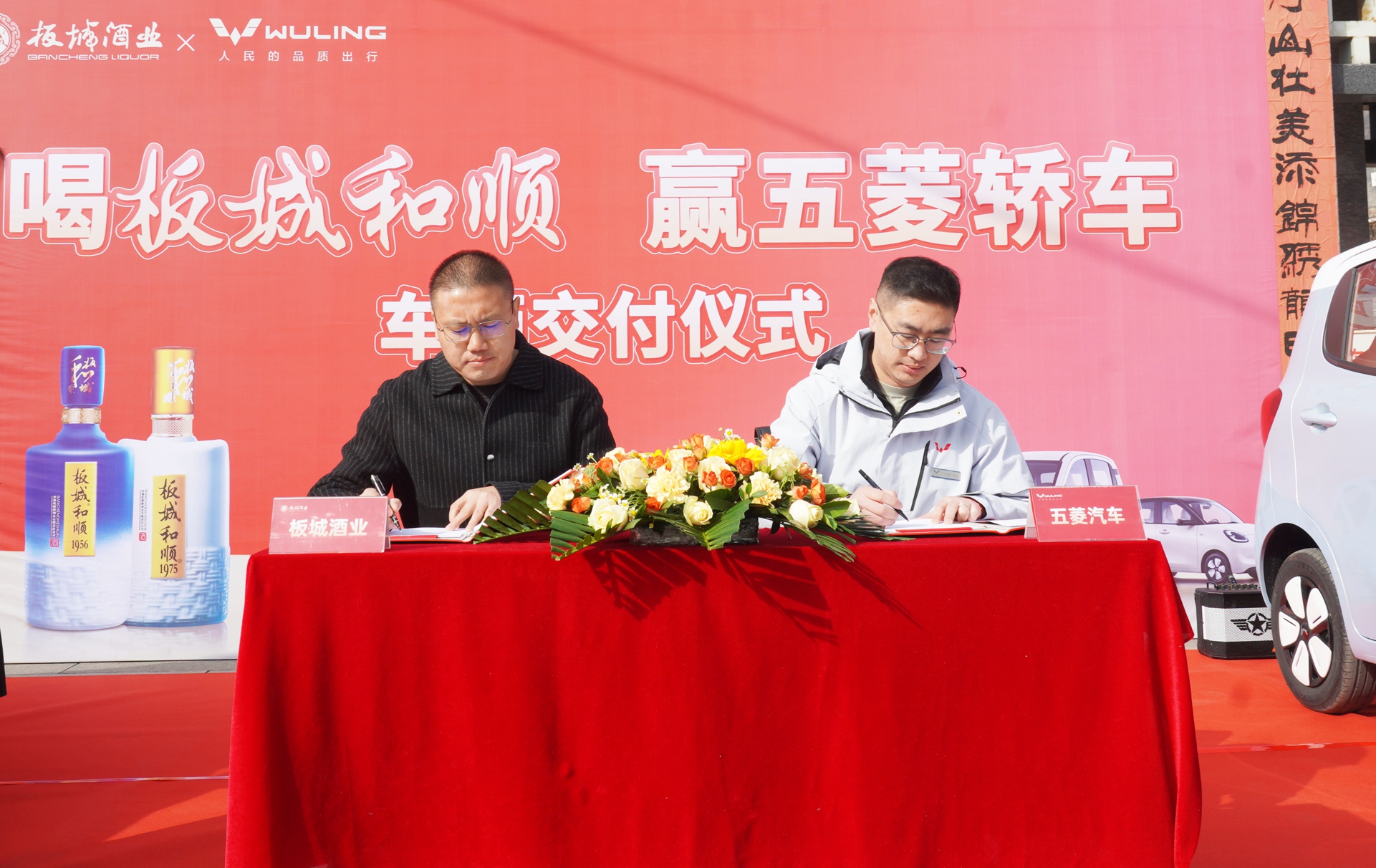 在活動現(xiàn)場,板城酒業(yè)銷售市場總監(jiān)王曉波與五菱汽車承德駿盛4S店市場總監(jiān)呂呈濤共同簽署了《五菱宏光MINIEV汽車交付協(xié)議》。